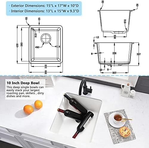 15 Inch Bar Sink Undermount Kitchen Sink – VASOYO 15″x17″ Wet Bar Prep Sink White Undermount Kitchen Sink Dual Mount Single Bowl Granite Sink Single Bowl Undermount Bar Sink with Bottom Grid & Drain