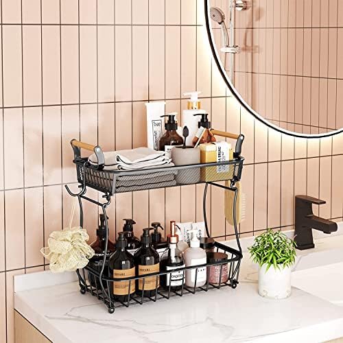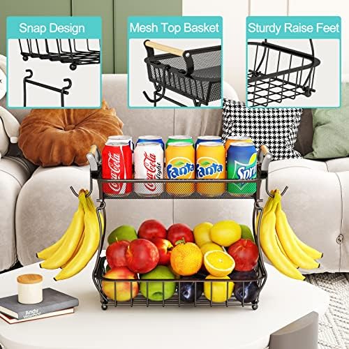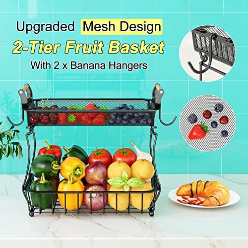 2 Tier Fruit Basket Bowl with 2 Banana Hangers for Kitchen Counter, Vegetable Countertop Produce Storage Holder, Large Capacity Metal Wire Fruits Stand Organizer for Onion Potato Bread Snack, Black