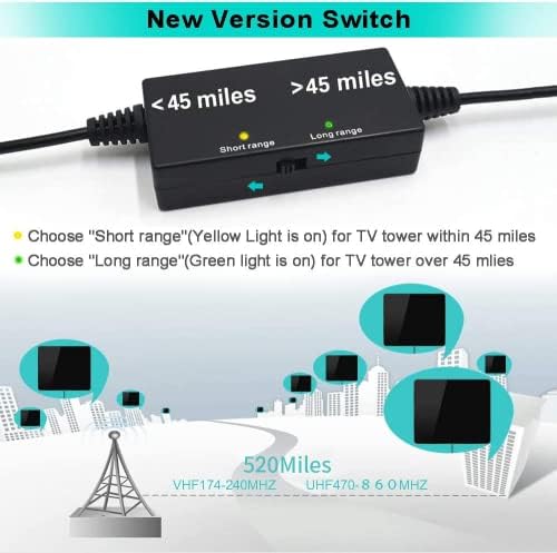 ✅ Smart Signal Booster Amplified 520 Miles – This HD antenna built-in Smart IC Chip Powerful Amplifier Signal Booster. The technology optimize itselfs signal transmission and against other signals interference. With the performance amplifer, antenna up 520 Miles range which provide added range and maximum signal reception for more channels even you are far away form broadcast towers. If your house is within 45 miles of the tower, Turn the Yellow light on! Above 45 miles, Turn the green light on!