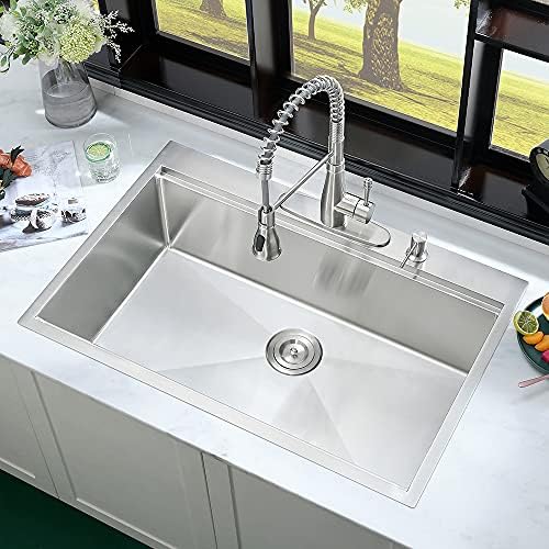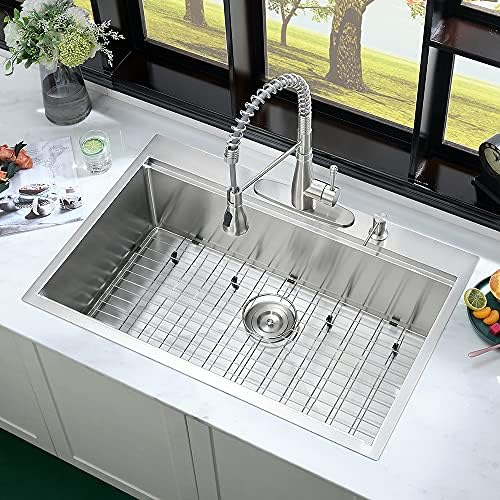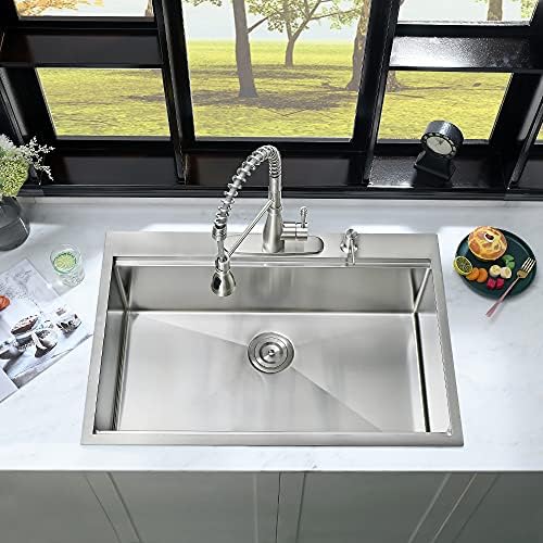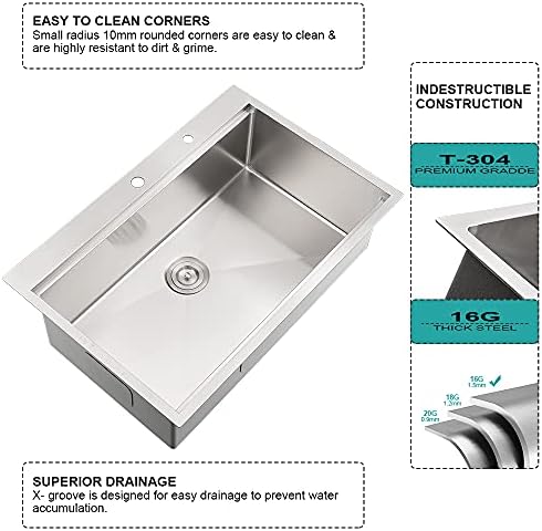 【Easy To Clean & Fast Drainage】The contemporary styling with R10 radius corners make this drop in sink easy to clean. A rear-set drain ensures optimal drainage, while 4 drain grooves on the sloped bottom of the sink help direct water to the drain, for a clean and quick-drying sink.