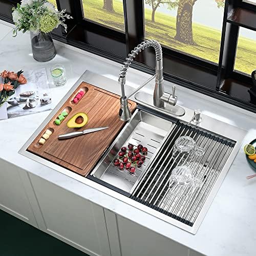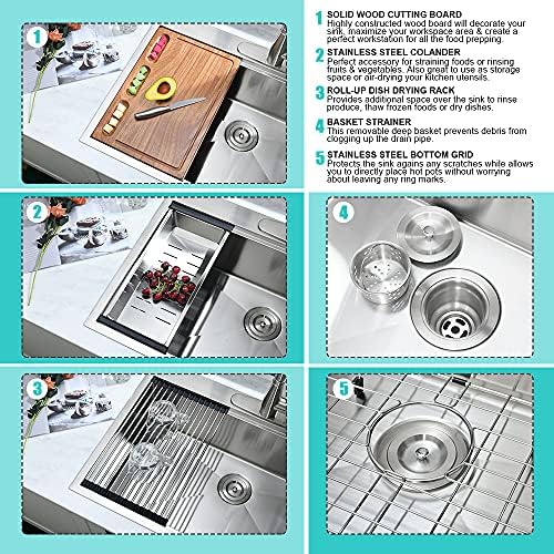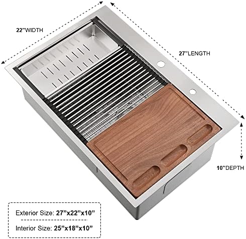 【Workstation Sink For Largest Space】27 inch stainless steel kitchen sink with integrated ledge that allows you to slide custom accessories across the sink maximize bowl size and offer more usable space in the sink, allowing large items like baking sheets to lie flat for easy clean up.