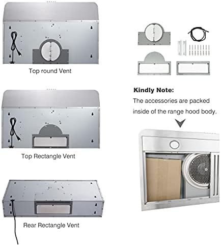 EASY INSTALLATION: 3 venting ways are optional, including top venting with round-shape outlet, top venting with rectangle-shape outlet, and rear venting with rectangle-shape outlet. Both round and rectangle outlet kits are included in the package. The range hood can be installed in the way of under-cabinet or wall-mounted, according to your specified need in kitchen.