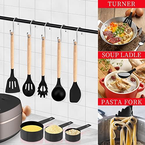 32 pcs Silicone Kitchen Utensils Set, Non-Stick Cooking Kitchen Utensils Spatula Set with Holder, Wooden Handle Silicone Kitchen Gadgets Utensil Set and Kitchen Gadgets Tools Set (Black)