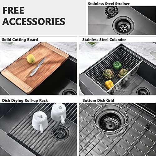 Package including: 1xpc 33 Black Kitchen Sink, 1xpc Solid Cutting Board is very sturdy, not easy to warp or crack, 1xpc Multi-Functional Stainless Steel Dish Grid protects the sink from scratches and acts as a drying rack for pots and pans, 1xpc Stainless Steel Strainer keeps drainpipe free of debris, 1xpc Dish Drying Roll-up Rack is used to wash produce, air-dry dishes, 1xpc Stainless Steel Colander, 1xpc Mounting Clips, 1xpc Installation Guide.