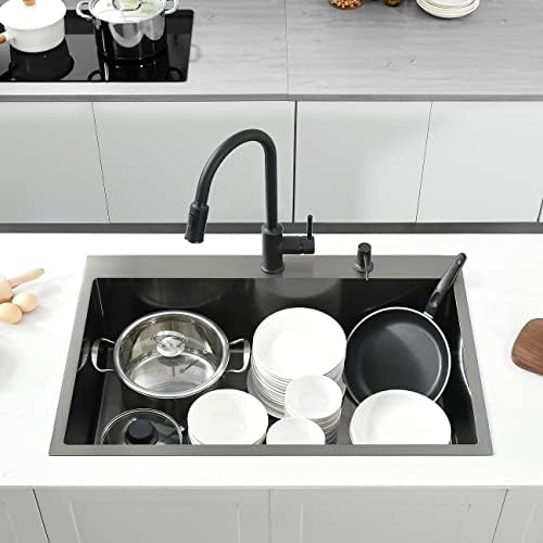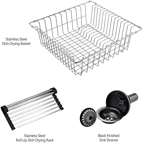 Package Includes: drop in kitchen sink, stainless steel roll-up dish drying rack(which can be put over the sink), and stainless steel dish drying/storage basket(It is smaller than the bowl of the sink, and can be put in the sink or on you kitchen countertop) , black sink drainer.
