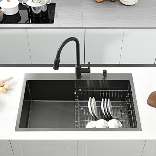 Package Includes: drop in kitchen sink, stainless steel roll-up dish drying rack(which can be put over the sink), and stainless steel dish drying/storage basket(It is smaller than the bowl of the sink, and can be put in the sink or on you kitchen countertop) , black sink drainer.