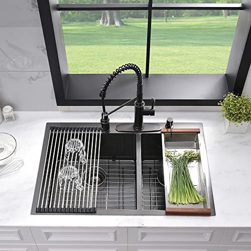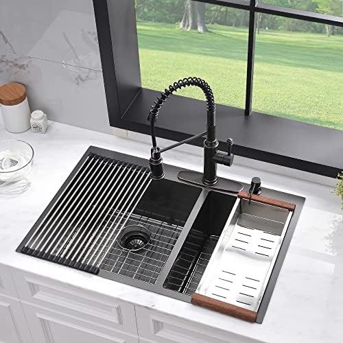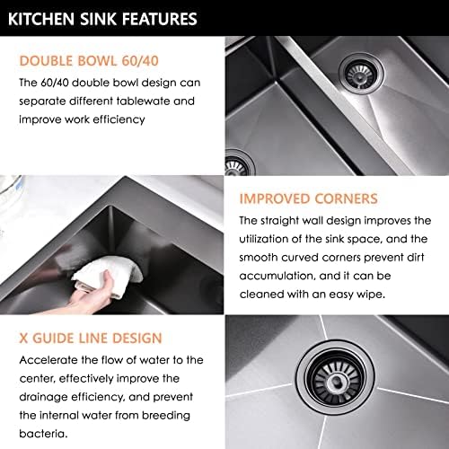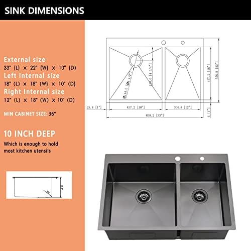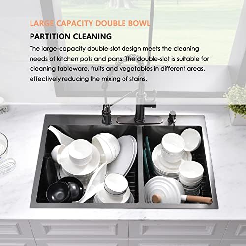 【Indestructible material】: This 33-inch double bowl drop in kitchen sink is made of SUS304 stainless steel TRU16 real 16 Gauge with superior strength and durability. The matte black gunmetal brushed finish is applied as an outer layer using an innovative NANO-PVD technique. Anti-physical scratching, anti-pot bowl bump,no water trace left, very easy to clean, anti-freezing heat and non-seepage water, long lasting and durability.