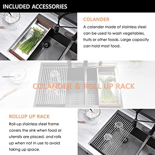 【What includes】: A 33-inch matte black double bowl kitchen sink, Colander, Roll up Rack, Bottom Rinse Grid(×2), Basket Strainer Drain Assembly(×2), Cutout Template, Mounting Brackets, Installation Guide.