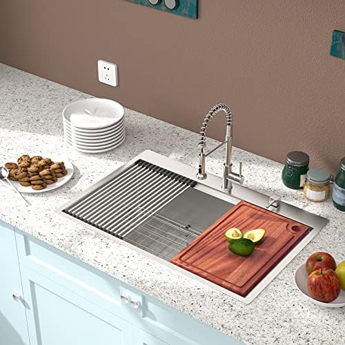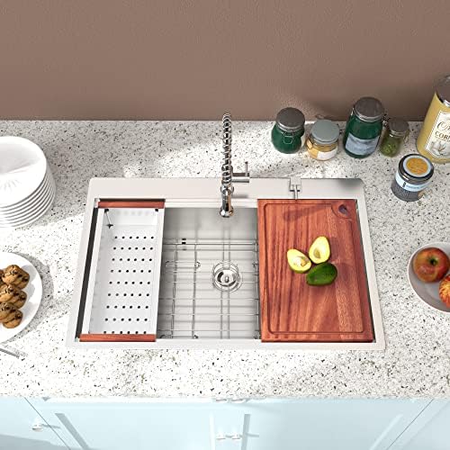 SPACE-SAVING ACCESSORIES ––Package includes a 33 inch drop in kitchen sink; SAPELE SOLID WOOD CUTTING BOARD; custom COLANDER with wood handle; ROLL UP DRYING RACK for drying dishes and cups; BOTTOM RINSE GRID for optimal draining prevents scratches; DRAIN ASSEMBLY with cover, Hardware, Template paper and installation guide.