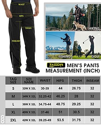 Waterproof & Breathable: Men rain pants with 5000mm Waterproof Rating and all seams are sealed. Prevents water from leaking through the fabric and seams. 3000gm Breathability Rating, making sure you dry on the inside.