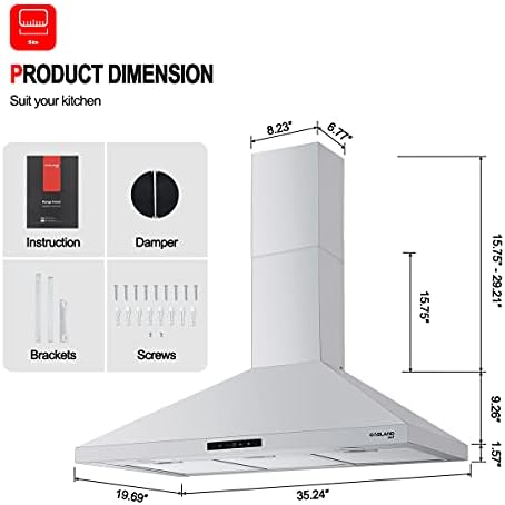 🎁【Simple Installation】This ducted touch control range hood comes with Installation parts, screws, air damper and user manual . Dimension: 35.2 in(W) x 19.7 in (D) x 40 in (H). Adjustable chimney: 15.8 in (min)-29.2 in (max). Fits 7.5- 8.5 ft ceiling. 3.9 feet 3-prong cord plug. Works under 120V~ 60Hz. Duct Size: 6 in.
