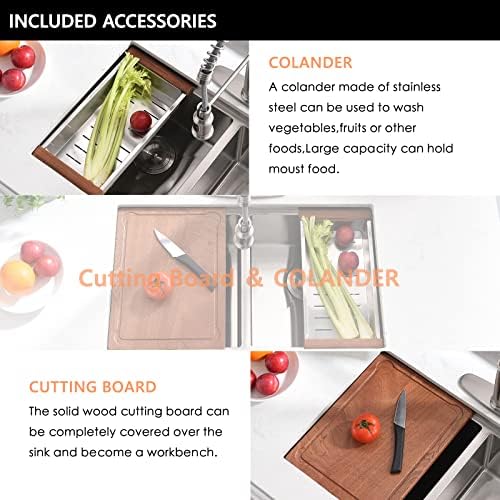 💎【Workstation with Accessories】: Workstation sink with integrated ledge lets you slide custom accessories onto the sink to simplify meal prep and cleanup, cutting board is made of solid wood that won’t crack or warp; roll Curtain Rack; Stainless Steel Drain Basin; Multifunctional Stainless Steel Dishwashing Mesh to protect the sink from scratches; Basket Strainer Plug for collecting food scraps or filling the sink with water.