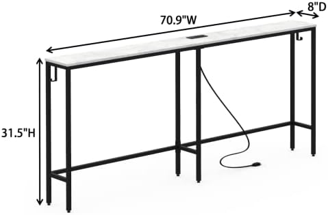 Leomonio 7.9" Narrow Sofa Table with Outlet, 70.9" Long Console Table Behind Couch, Skinny Table with Detachable Hooks and Charging Station for Entryway, Hallway and Living Room, Faux White Marble