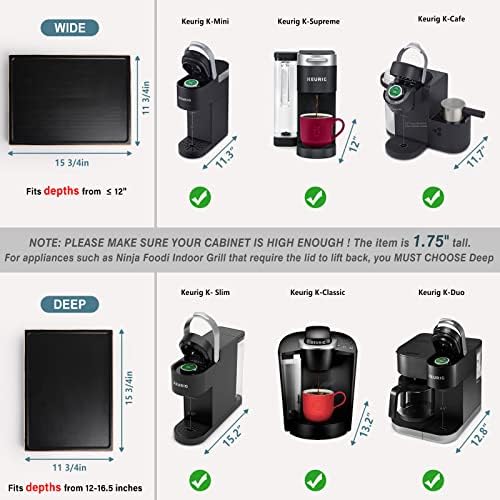 【Size selection suggestion】 WIDE is suitable for home appliances with a bottom depth of no more than 12″, while DEEP is suitable for appliances with a depth of 12″-16.5″. Please choose the appropriate size according to the depth of the bottom of your appliance. NOTE: The height of the sliding tray is 1.75″, PLEASE MAKE SURE YOUR CABINET IS TALL ENOUGH.