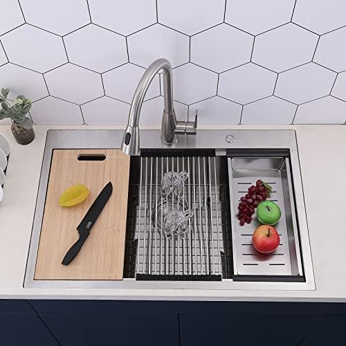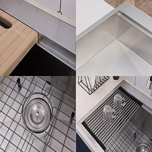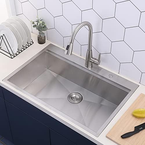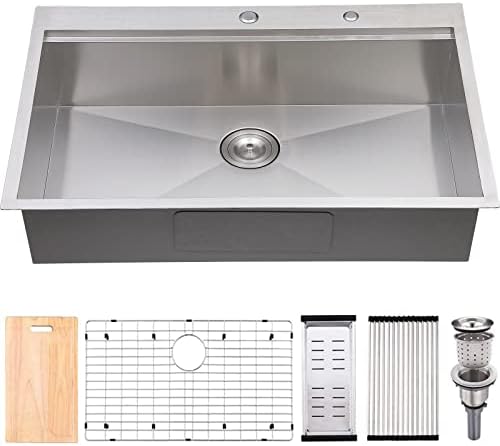 Kitchen Sink,33″L x 22″W Topmount Workstation Drop in Single Bowl 2 Hole 304 Stainless Steel 18 Gauge Handmade Kitchen Sink,Brushed Nickel Ledges Kitchen Sinks With Accessories