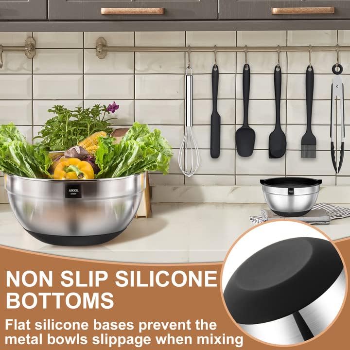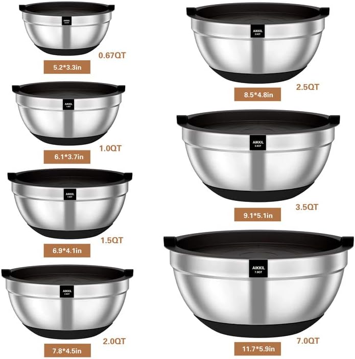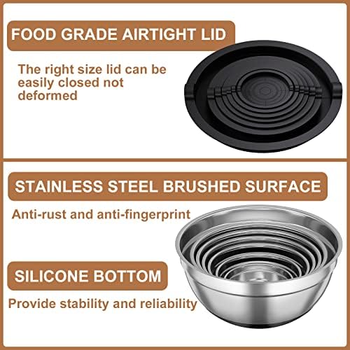 AIKKIL Mixing Bowls with Airtight Lids, 20 piece Stainless Steel Metal Nesting Bowls, Non-Slip Silicone Bottom, Size 7, 3.5, 2.5, 2.0,1.5, 1,0.67QT Great for Mixing, Baking, Serving (Black)