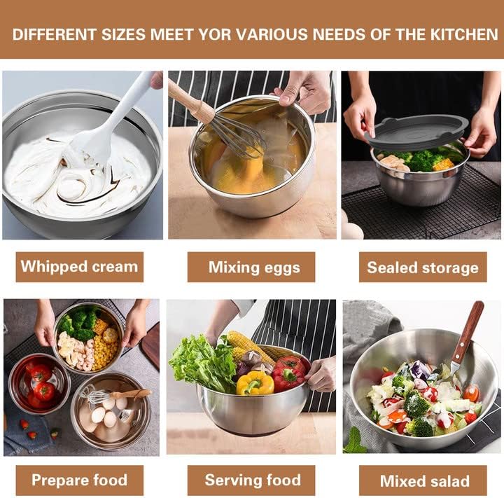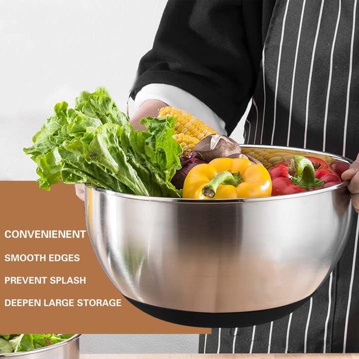 ✅NON SLIP SILICONE BOTTOMS: Each of the bowl comes with silicone bottom to keep the bowl from moving around on the countertop while mixing, kneading or whipping food, you can easily mix all your favorite ingredients and foods and need not to worry about the bowls will wobble when mixing, beating and whipping