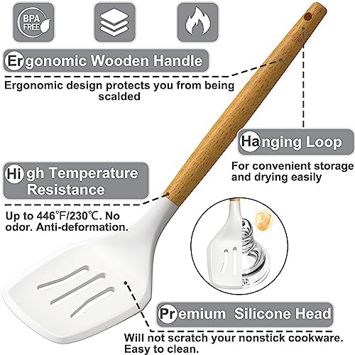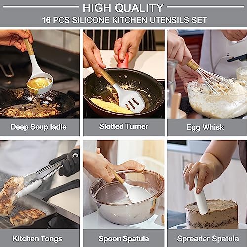 AIKKIL Silicone Cooking Kitchen Utensils Set, 16 Pcs Cooking Utensils Set with Holder, Heat Resistance, White Wooden Handle Silicone Kitchen Gadgets Utensil Set for Nonstick Cookware