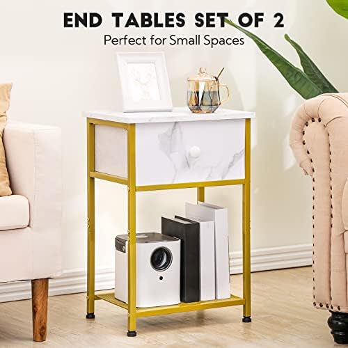 AMHANCIBLE Nightstands Set of 2, End Tables Living Room with Drawer, White Side Tables with Storage Shelf, Night Stands for Bedroom, Wood Metal Accent Furniture HET03DGMB