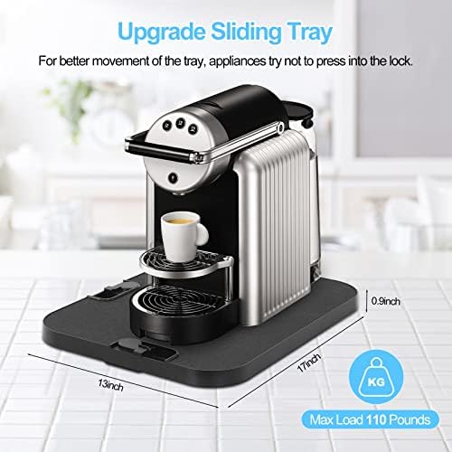 【EXTRA LARGE TRAY】Only 0.9” (23mm) high, max weight capacity is 110 lbs. Tray size is 13” wide by 17″ deep. Works with Ninja Grill, KitchenAid Stand Mixer, Keurig Coffee Maker, COSORI Air Fryer, Vitamix Blenders, Instant Pot and more countertop appliances. (Note: Don’t put appliances on top of the lock)