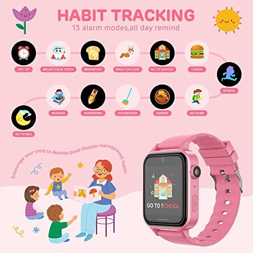 【Education & Learning Toys】 Kids game watch has 13 alarm clock modes,which contain what to do in one day. Such as get up, brush your teeth, go to school,go home,sports, reading, go to bed,housework etc.all day reminder,the habit tracking feature helps children develop good habits,it is a great toys for 3+ year old girls and boys.