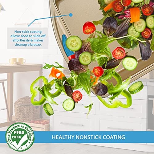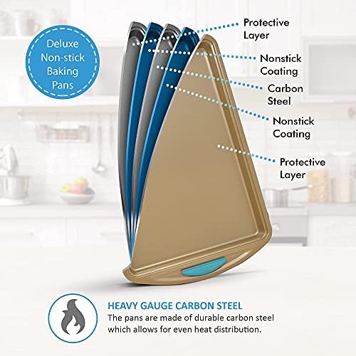 100% NON STICK COATING: Worried about food sticking to this bakeware set? You shouldn’t be. The entire set is made from heavy duty and BPA-free CarbonSteel Metal and it’s shielded with non-stick coating that is extra firm, does not emit any weird odors or smells and it is also scratch resistant!