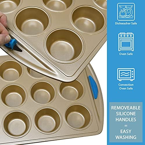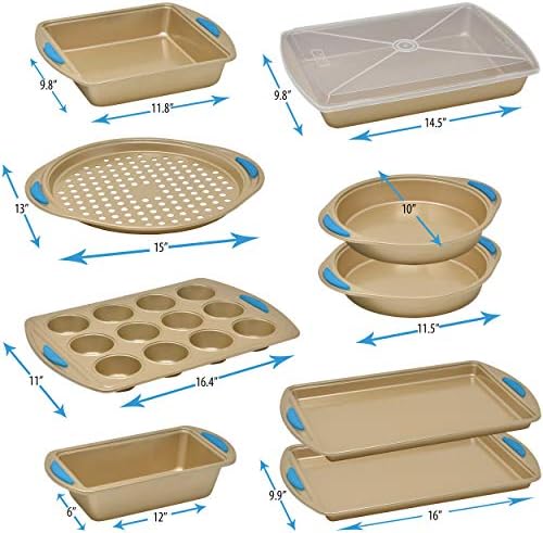 Baking Pan 10 Piece Set Nonstick Gold Steel Oven Bakeware Kitchen Set with Silicone Handles, Cookie Sheets, Round Cake Pans, 9×13 Pan with Lid, Loaf Pan, Deep Pan, Pizza Crisper, Muffin Pan by PERLLI