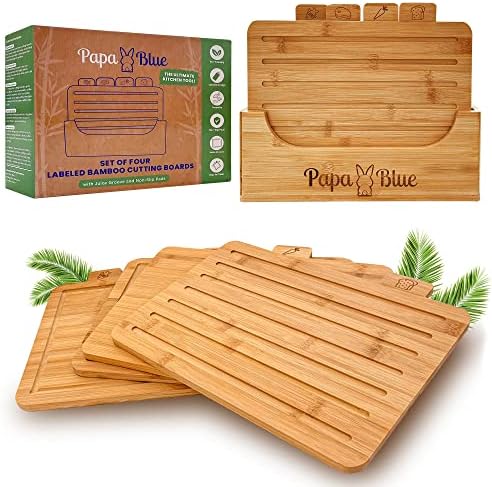 Introducing this beautiful Bamboo Cutting Board Set By Papa Blue. The perfect kitchen accessories. Crafted from 100% natural bamboo, this labeled set of 4-piece act as an easy organizer. This bamboo set of chopping board is eco-friendly, extra durable, and makes your countertop beautiful and your kitchen meal prep a breeze. The stylish cutting board holder adds elegance.Perfect as house warming gifts, anniversary gift or cute set for your kitchen. From chopping fruits to juicy meats, Papa Blue does it all! Elevate your cooking experience today.