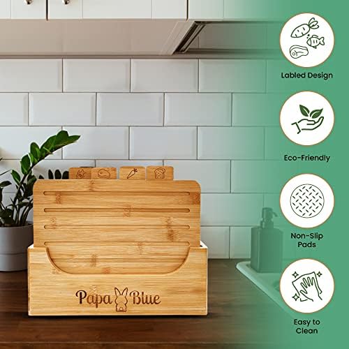 PERFECT GIFT CHOICE: Looking for the ideal gift for housewarming, anniversary, wedding, or simply a gift set? Look no further than the Papa Blue Bamboo cutting board Set with holder of Four Labeled Cutting Boards. With its combination of practicality, style, and quality craftsmanship, this cutting board set is sure to impress and delight any recipient.