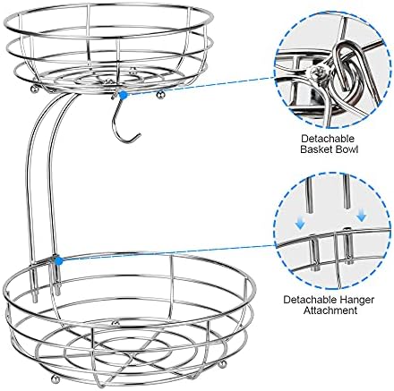 Bextsrack 2-Tier Countertop Fruit Basket Bowl with Banana Hanger, Metal Wire Vegetable Produce Storage Baskets for Kitchen, Fruits Stand Holder Organizer for Bread Snack Veggies, Silver