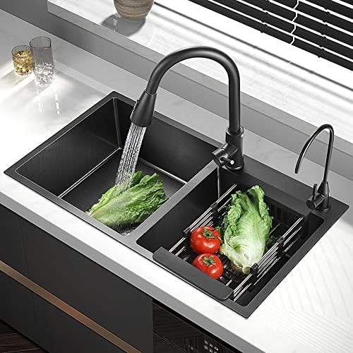 Black Double Bowl Kitchen Sink, Stainless Steel 32.3 x 17.7 Drop In Topmount Bar Sink Nice Kitchen Sink Combo-Storage Organizer, Faucet Sprayer, Drain Strainer Set for Modern Kitchen Sink