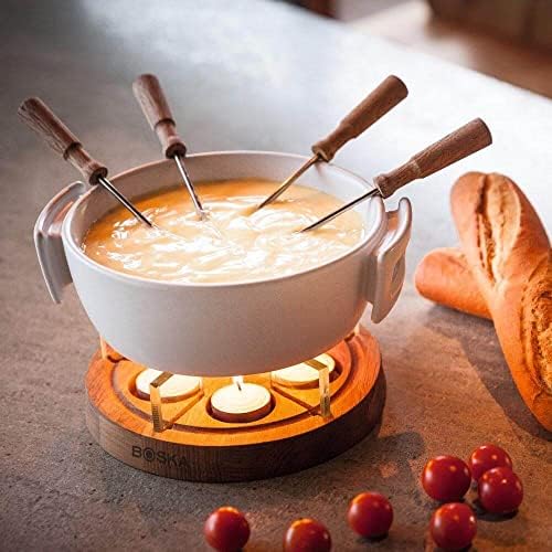 Candle Light Fondue Twinkle What makes the Candle Light Fondue Twinkle special is the fact that it’s heated by five tea lights. These twinkling candles keep your cheese warm. It also adds extra ambiance to your cheesy dipping of vegetables, bread, and meat. It’s perfect for cozy summer nights in the garden under the stars. -AWARD WINNING DESIGN: This product won the prestigious Red Dot Award for Product Design in 2016-SIMPLE & ELEGANT: This fondue set is heated by candle light – no lighter fluid, no cords – adding a romantic ambiance to your evening-FIREPROOF & MICROWAVE SAFE: Melt your cheese or chocolate in a flash Cheese Fondue: A Grand Swiss Tradition The word fondue is a form of the French verb fonder (“to melt”). It’s a dish that’s gaining more and more popularity – because who doesn’t love dipping bread and other garnishes into fresh, hot cheese? The most classic Swiss fondue recipe is made with cheeses such as Gruyere, Vacherie and Emmentaler. However, cheese fondue comes in many varieties. The ready made versions found in the supermarkets are usually a fine starting point to invent your own creations. Maintenance The fondue pot is microwave safe as well as dishwasher safe. The oak base is best cleaned by hand. A monthly rub of mineral oil will keep the wood looking great. Contents1 Liter stoneware fondue pot | Oak wood base with glass dividers | 4 stainless steel fondue forks with oak wood handles | 5 tea lights About Boska Holland Cheese wares We love cheese! Since 1896, here at Boska, it’s been our mission to spread the love of cheese to everyone everywhere. Our innovative family-owned company started as a blacksmith making tools for the cheese farmers in Holland, and now we are the world’s only specialist in Cheese wares: cheese tools and accessories. In short: we sell everything you need to enjoy cheese except the cheese itself!