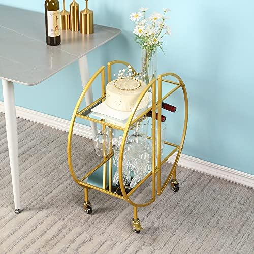 SILKY GOLD-TONE: Gold frame and mirrored shelf adds a touch of luxury. You can use this rolling bar cart to store cocktail and plates, make an accent statement in your entryway, kitchen, living room or bathroom with a stylish and decorative gold round bar cart