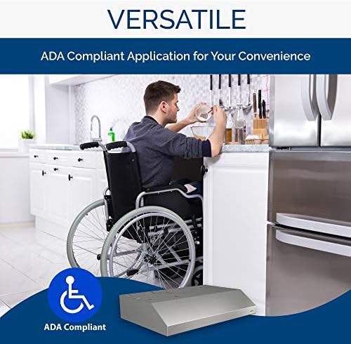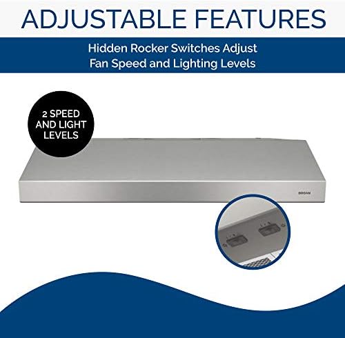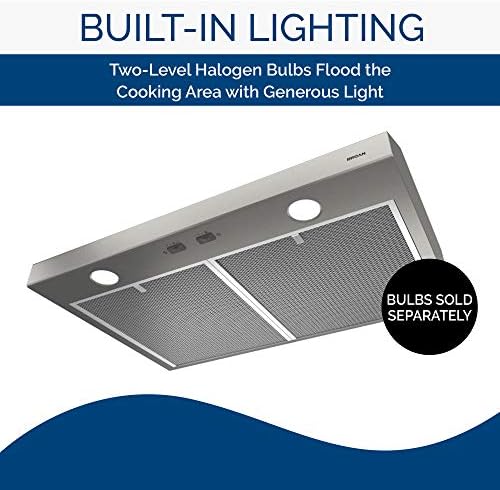 Upgrade your kitchen with the Broan-NuTone Glacier 30-inch Under-Cabinet Convertible Range Hood! This versatile range hood insert offers a complete solution to your ventilation needs by providing both an exhaust fan and overhead light for your stove. This range hood provides a MAX 300 CFM and 5.0 Sones blower performance to quickly remove smoke and cooking odors from the air, and the hidden 2-speed rocker switch allows for quick fan adjustments and provides the ideal level of ventilation every time you cook. It also features the Captur system – an advanced blower design with a forward positioned centric inlet to remove 97.4% of smoke and odors faster. The 2-level built-in lights accept up to 50-watt halogen bulbs (not included) to evenly illuminate your cooking area, and they are also controlled by a hidden rocker switch for ease of use. This sleek stainless steel range hood fits neatly underneath cabinets, and it features mitered sides and a hemmed bottom with no sharp edges to help ensure safety and provide a more decorative look. The two one-piece dishwasher-safe open mesh grease filters offer easy cleaning so you can maintain optimum grease capture and keep your kitchen ventilated. This 4-way convertible range hood unit measures 19.625″ x 30″ x 6″ and installs as 3.25″ x 10″ ducted opening connected vertically or horizontally with damper, 7″ round vertical ducting (damper sold separately), or as non-ducted with air recirculation (filter sold separately) to provide versatile installation options at least 18″ above the cooktop. It includes hidden louvers on top of the hood that exhaust away from the cabinetry. It can work in an ADA-compliant application as well. It is both UL-Listed and HVI-2100 Certified for safety and protection, and it includes a 1 year limited warranty. Enhance your kitchen with the Broan-NuTone BCSD130SS Range Hood!
