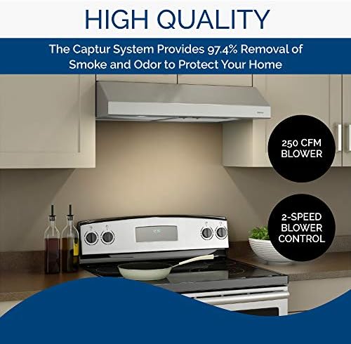 IMPROVES KITCHEN AIR QUALITY: Captur system provides a MAX 300 CFM and 5.0 Sones performance to remove 97.4% of smoke and cooking odors from the air faster, and the hidden 2-speed rocker switch allows for quick adjustments