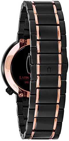 In Stainless Steel with black and rose gold-tone IP finish, black dial with rose gold-tone accents and Sub sweep seconds hand feature, anti-reflective domed Sapphire glass, screw-back case with Latin Grammy logo stamp on back, Black IP and rose gold-tone stainless steel bracelet with double-press deploy ant closure, and water resistance to 30 meters.