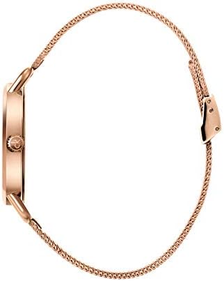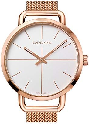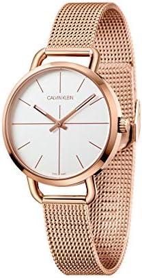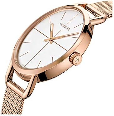 White dial enhanced by luminous rose gold-tone hands. Rose Gold PVD stainless steel case with a rose gold pvd stainless steel mesh band. Quartz movement. 30 meters / 100 feet water resistance. Fixed bezel. Scratch Resistant Mineral crystal. Solid caseback. Fold Over Slip Through clasp. Pull / Push crown. Case size 36 mm x 8 mm. Band 14 mm x long. Calvin Klein K7B23626 Even Watch.