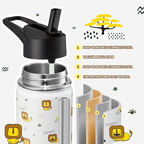 COKTIK 14 oz Kids Insulated Water Bottle with Straws and 2 Lids, BPA Free and Leakproof Double Walled Stainless Steel Kids Water Bottle for School, Sports, Travel (lion)