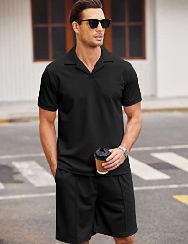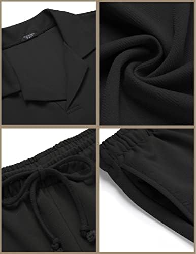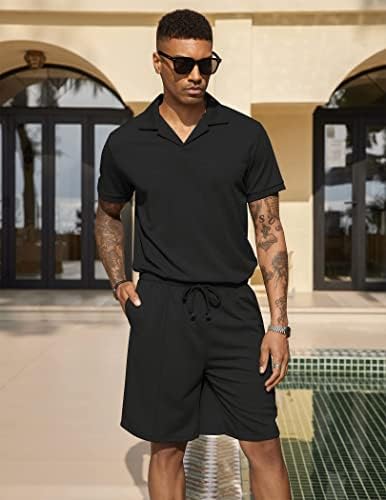 The casual polo shirt set is finished with a camp collar, which gives it a casual feel but yet also has a sophisticated look to it. These shorts are above knee length, with 2 side pockets and 1 back pocket for storage, elastic waist with adjustable drawstring allows you to adjust your waistline.The crisscrossed pattern of the fabric also gives it a unique look.