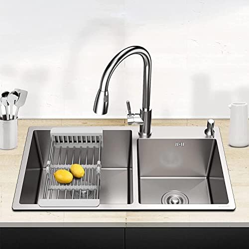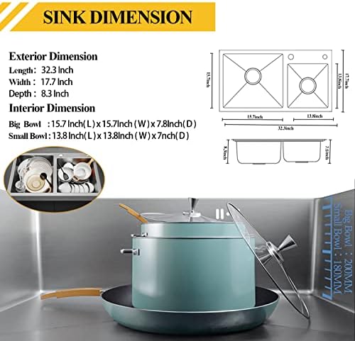 Double Bowl Kitchen Sink Dimension: Exterior dimensions-17.7″Wx32.3″Lx8.3″D, Interior dimensions-Big Bowl:15.7″Wx15.7″Lx7.8″D, Small Bowl: 13.8″Wx13.8″Lx7″D. The depth and With of the stainless kitchen sink will be perfect for doing large dishes and pans.