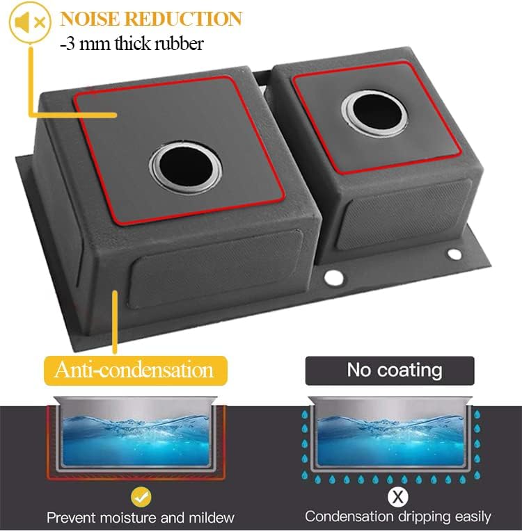 Sound-proof Kitchen Sink: 3mm thick rubber pad on all sides help to minimizes water drumping sound and reduces vibration. The sound deadening on this sink is great! Almost no noise at all, which is impressive for a stainless steel sink.