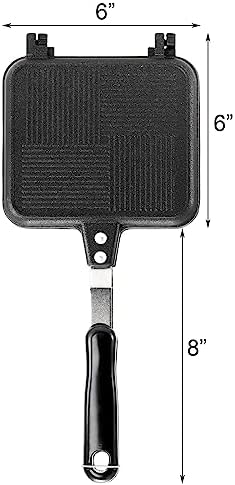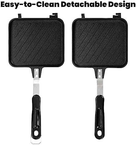 This pan is made of heavy-duty aluminum alloy and features non-stick coating, making it easy to cook and remove sandwiches and cheese. This aluminum casting body offers energy efficiency and high heat conduction, making it extra durable against scratches. A detachable design allows you to easily remove this hot sandwich & panini maker into 2 parts and fix them together as needed. It has a lock on one side of the handle and a groove on the other, which allows the handles to lock together when flipping the pan.