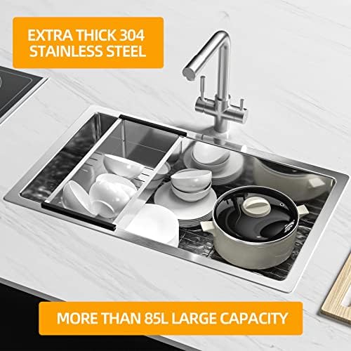 Functional accessories:3.2cm pure natural oak cutting board, to ensure clean and healthy food, fumigation process, no mold, 200,000 cutting test, durable, perfect fit for the sink. 1mm thick stainless steel shelf, food grade material, the surface is chrome-plated and polished.