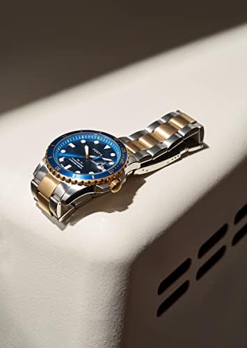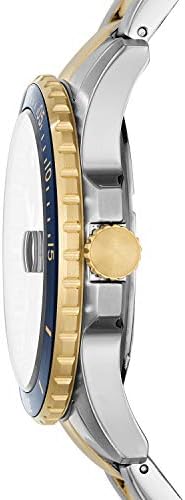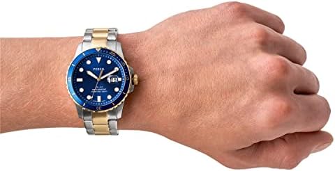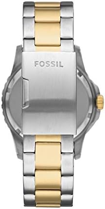 Stainless steel case with blue sunray dial; two-tone silver and gold stainless steel bracelet band; links can be removed for a customized fit; interchangeable with all 22mm Fossil watch straps