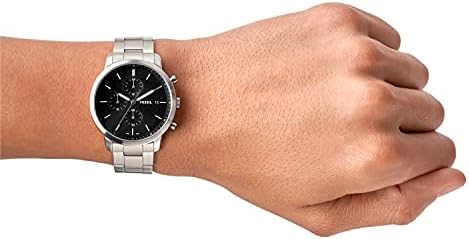 Stainless steel case with black dial; stainless steel bracelet band made from at least 50% recycled stainless steel; links can be removed for a customized fit; interchangeable with all 22mm Fossil watch straps