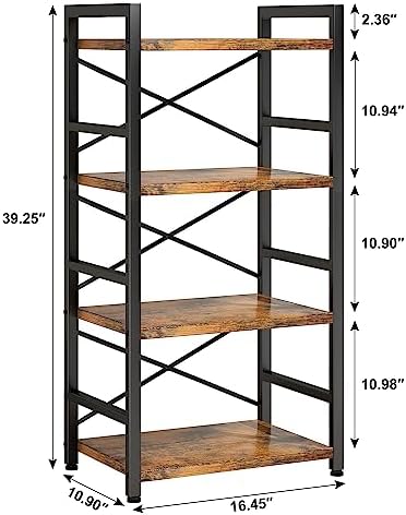 Homeiju Bookshelf, 4 Tier Industrial Bookcase, Metal Small Bookcase, Rustic Book Shelf Storage Organizer for Living Room, Bedroom, and Home Office(Rustic Brown) Patent Pending D29873033
