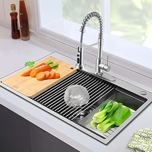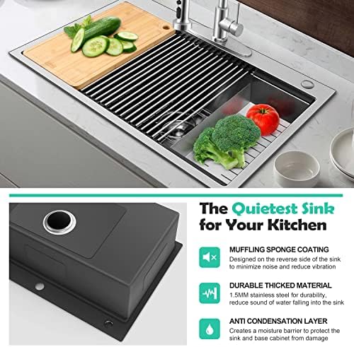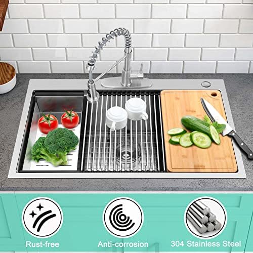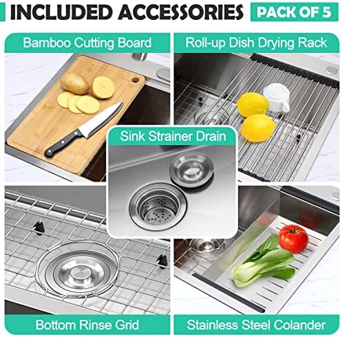 Great attachment, T304 stainless steel sink comes with 5 pack kitchen sink accessories for your daily kitchen life, includes cutting board for convenient use, roll up drying rack to air drying washed dishes for additional space, kitchen sink strainer, stainless steel colander rinses fruits and vegetables for no mess on counter, bottom rinse grid protects sink surface, plus a cutout template and some mounting clips help install quickly