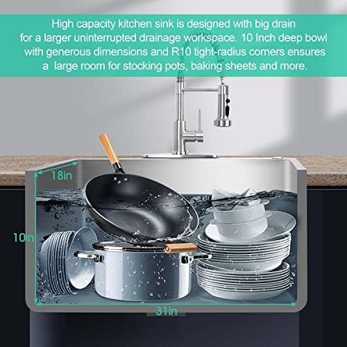 33 Inch workstation sink, farmhouse kitchen sink has great external size: 33″L x 22″W x 10″D, internal size: 31″L x 18″W x 10″D, minimum cabinet size: 36″, 3.5″ standard drain opening, large and deep enough for washing your cooking pots, sheets, bowls and plates, feature with tight radius R10 rounded corners for easy cleaning and modern aesthetic, ideal big kitchen sinks to fit with most family and match well with your perfect kitchen appliances