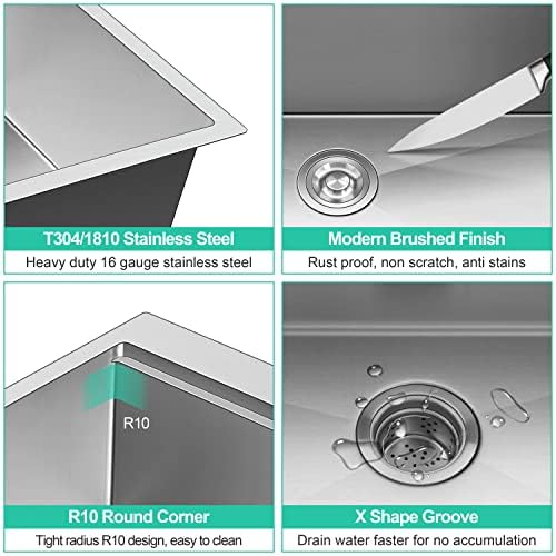 Easy draining and modern coating, single bowl kitchen sink with big drain, sloped bottom and X shape water flow guidelines ensures optimal water drainage, anti condensation layer prevent the sink from getting damp and rusting due to excessive temperature difference, muffling sponge coating on reverse side minimize the sound of water falling into the sink, reduce the impact of noise and bring you a quiet environment, perfect upgrade and supplement to your kitchen