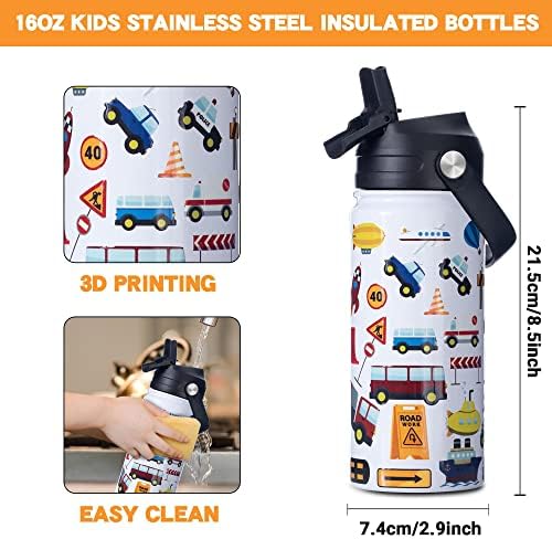 HOMMBENM Kids Bus Water Bottles With Straw Lids Stainless Steel Vacuum Insulated Double Wall Wide Mouth Water Bottles for School Boys,Girls (Bus,16oz)
